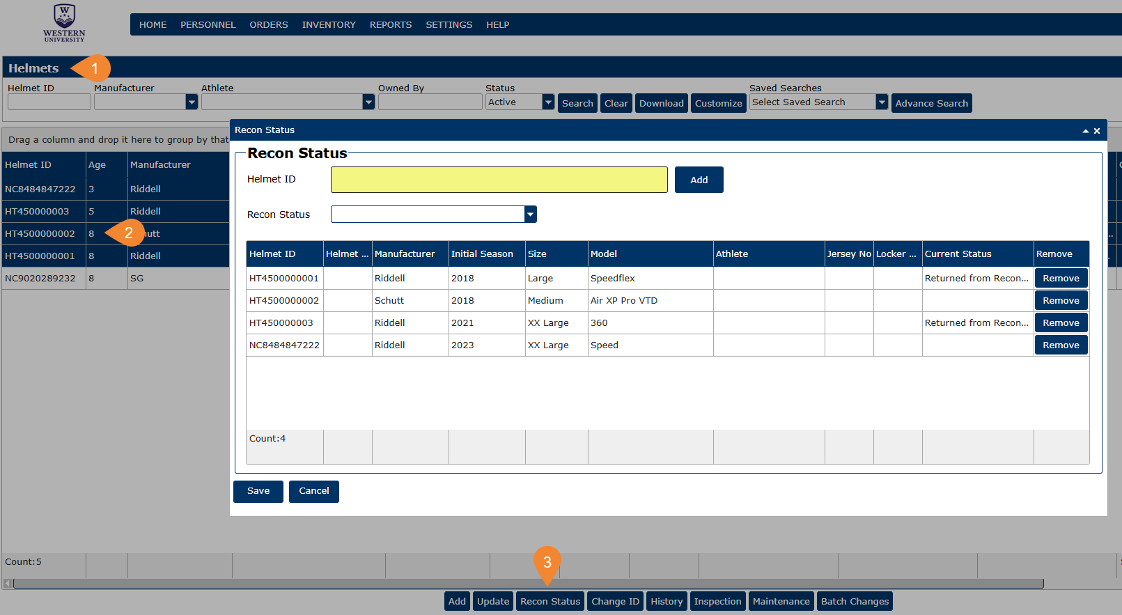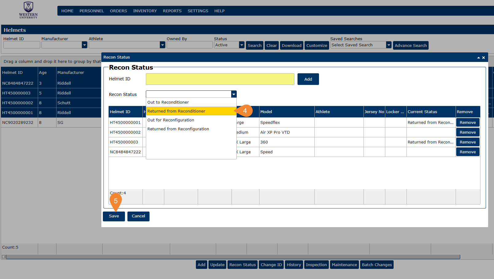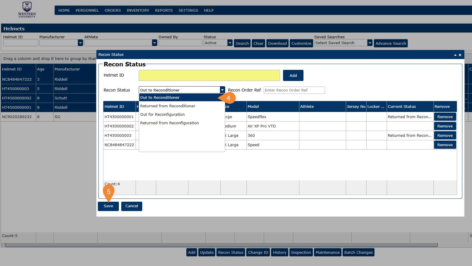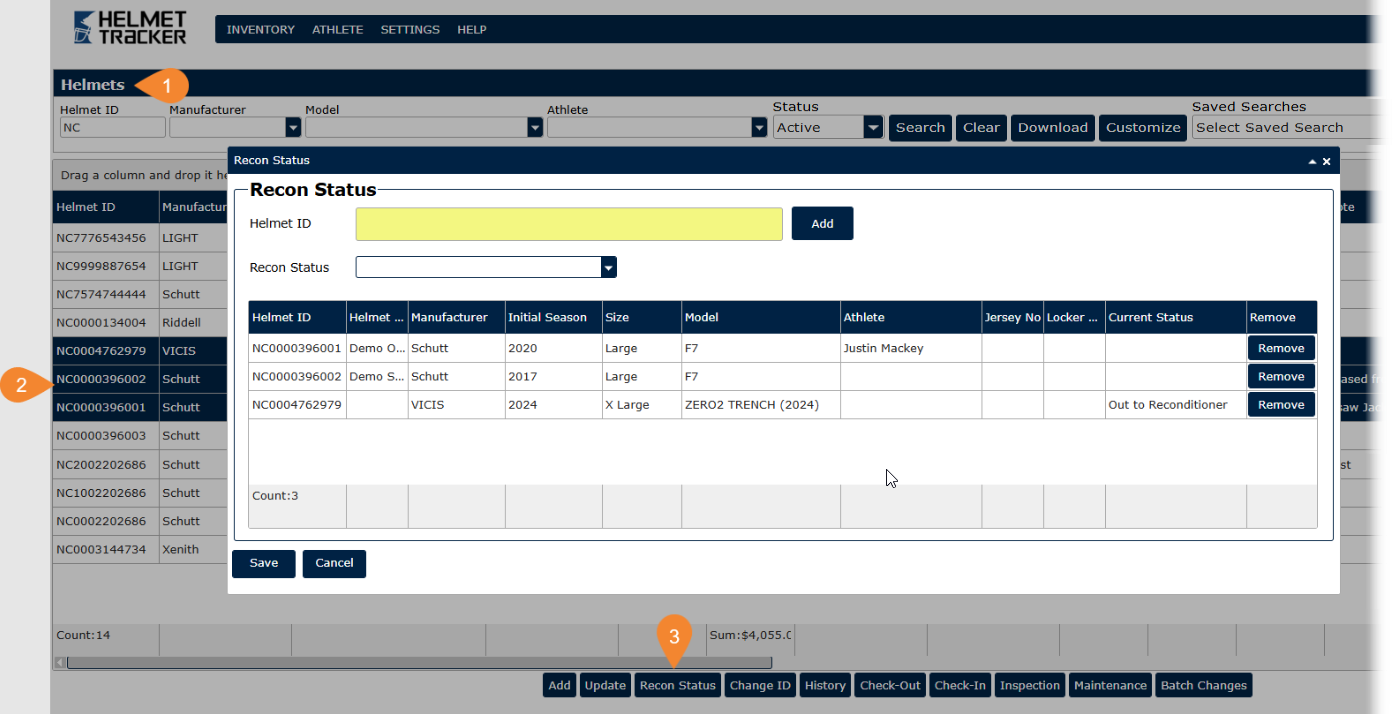Once you have decided which helmets to recondition/recertify, you can follow these steps to update your helmets in the system.