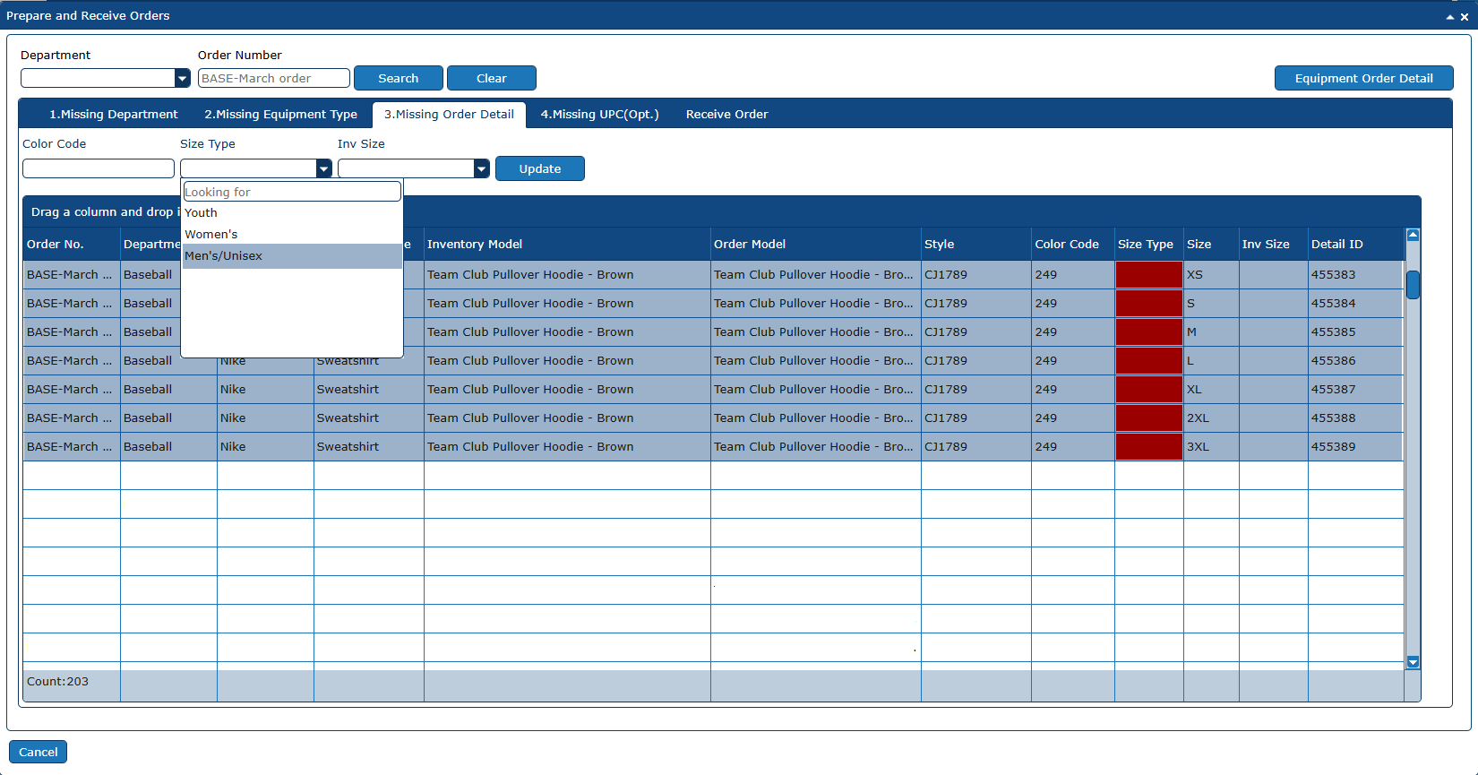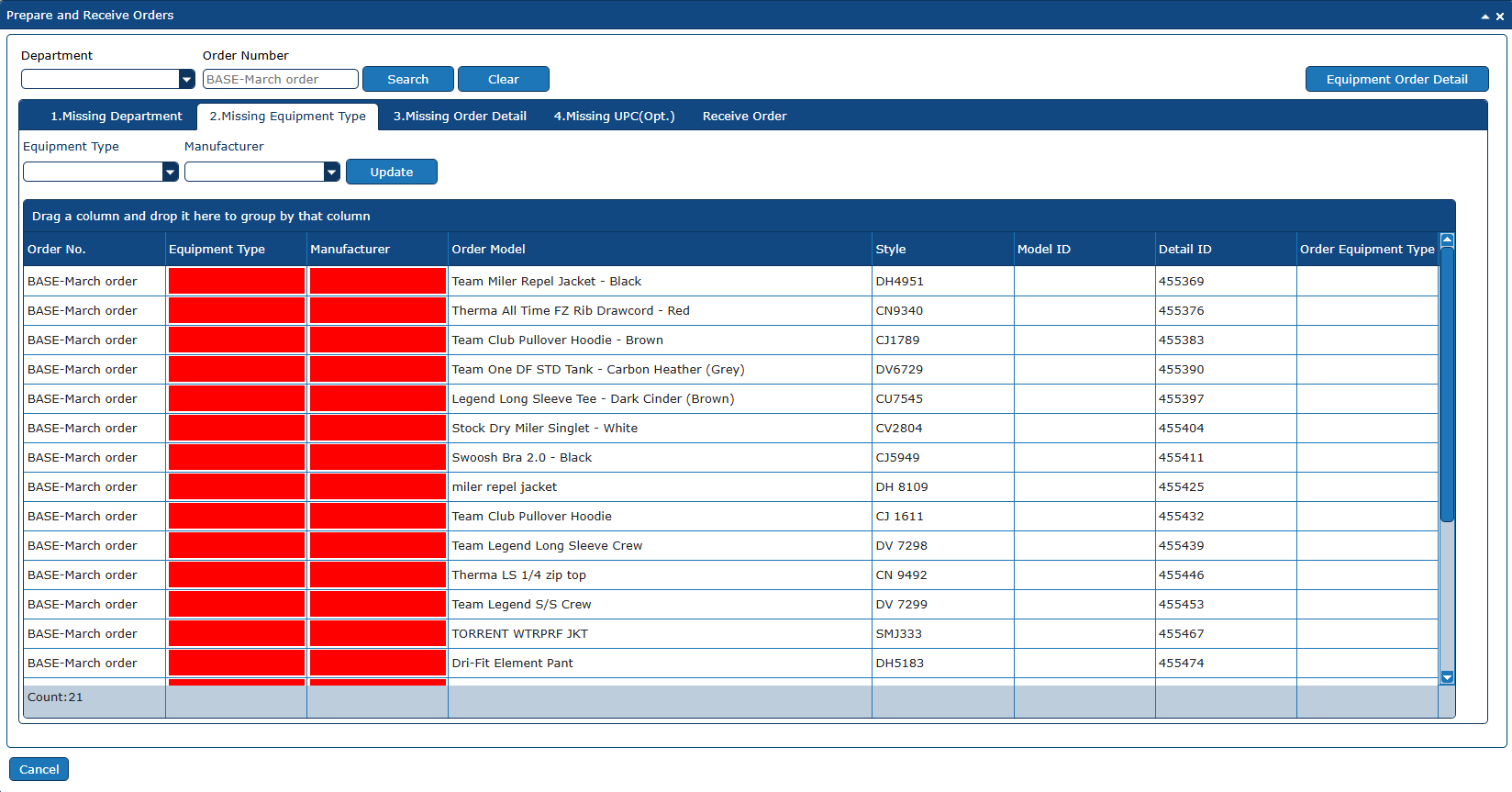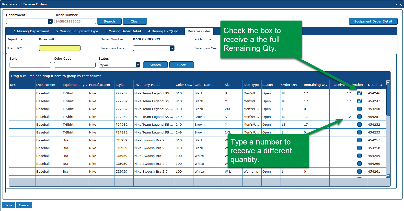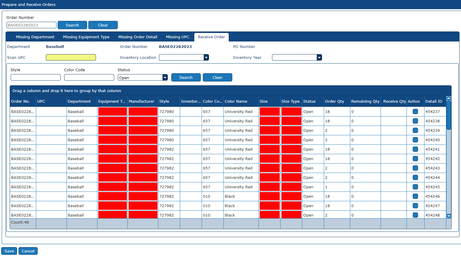 To receive your orders correctly into inventory, the following information is needed: department, equipment type, manufacturer, style, color code, size type, and size. If any of these values are missing, they are highlighted in red on the Receive Order screen, and the order can not be received until the information is filled out. (See image below) Preparing orders can be done well ahead of the order's arrival.