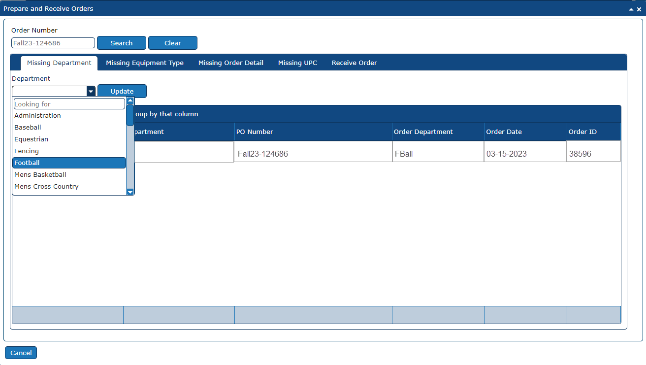 Highlight one or more orders on the grid using the Shift or Ctrl keys. Choose a Department from the drop-down and click Update. The Department will be assigned to the highlighted orders, and they will disappear from the Missing Department tab.